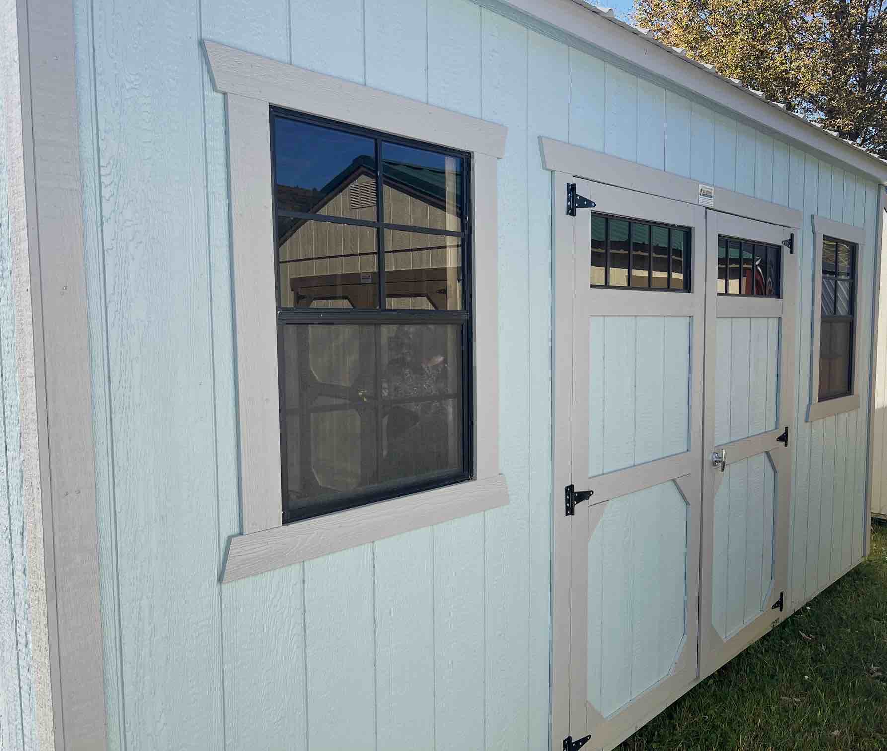 This 10’x12’ single sloped shed with double doors with windows, a 2×3 window, window shutters, and tech shield options allows for a fashionable storage or personal space. Peppercorn exterior trim with a black roof make this unit a stand out.